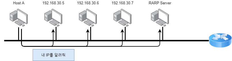 BroadCast로 자신의 MAC 주소로 자신의 IP 주소를 알기 위해서 요청하면, RARP Serever는 너 이런 IP를 사용해! 라는 식으로 IP를 할당해준다.