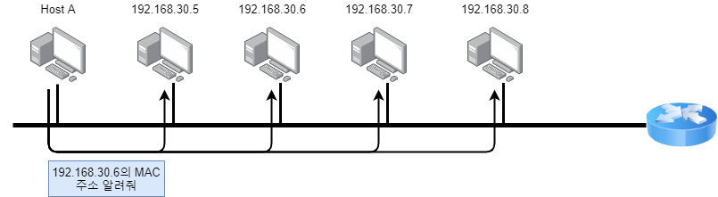 1. 초기 Host A는 192.168.30.6에 MAC주소를 알지못하기 때문에, 네트워크 전체에 192.168.30.6에 대한 MAC 주소를 물어보는 요청을 보낸다.(Broadcast)