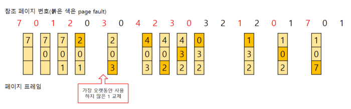 OPT 보다는 페이지 결함이 더 일어날 수 있지만, 실제로 사용할 수 있는 페이지 교체 알고리즘에서는 가장 좋은 방법이다.