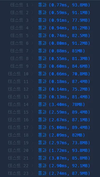 | 풀이 | 평균 실행 시간(ms) | 평균 메모리 용량(MB) |